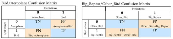 Moreover, we investigated if a two-stage classification method has a performance that is sufficient for recognising a specific group of objects, as shown in Figure 1. In the first stage, the system separates avifauna from aeroplanes, and the hypothesis is that the classifiers can reach an accuracy of 95% and a recall of 97%. In the second stage, endangered birds (big raptors from Accipitriformes order: Buteo buteo, Milvus milvus, Haliaeetus albicilla) are distinguished from common birds. This classification should have at least 75% accuracy and 90% recall to be of practical use [8,9].
