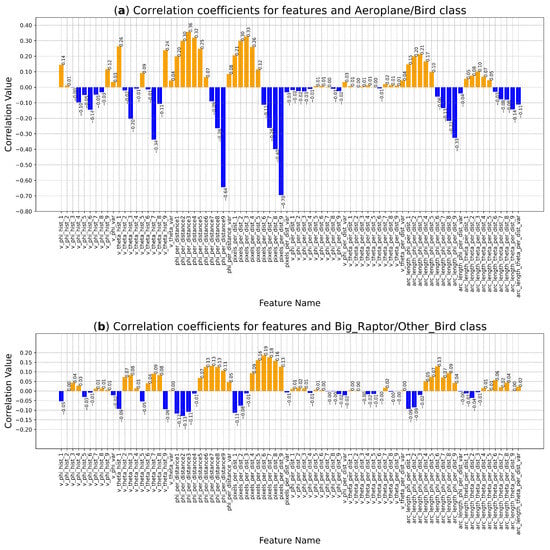 Correlation coefficients for numerical features: (a) the Aeroplane/Bird classes in the whole dataset; (b) the Big_Raptor/Other_Bird classes in the bird-only dataset. Positive correlation: orange, negative correlation: blue. Note: the scales on the y axis are different for both charts.
