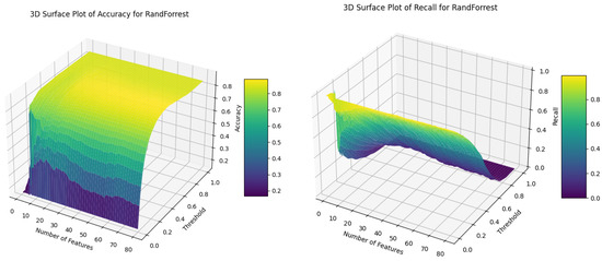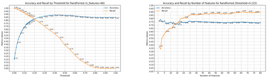RF performs best, reaching an accuracy and recall ratio of 75% and 90%, respectively, for 66 features at a threshold of 0.125. With higher thresholds between 0.18 and 0.2, its performance is more balanced, ranging from accuracy = 80% and recall = 85% to accuracy = 82% and recall = 82%. The scores plotted as surfaces with respect to the number of features and thresholds are presented in Figure 6. Line plots for the metrics values vs. threshold for 66 features and the metrics values vs. the number of features for threshold 0.125 can be seen in Figure 7. From the plots, one can see how selecting an optimal threshold is crucial for obtaining high classification scores, especially for recall, which is more sensitive to the thresholds than accuracy. For clarification, recall’s variability comes from the fact that it relies on minority classes (big raptors represent only 15% of all the birds), while accuracy depends on the whole dataset and is more stable.