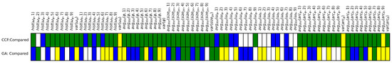 In Figure 8, the feature sets from the CCF and GA selection methods for both binary classification tasks using an RF-based classifier are presented. It can be seen that GA selects fewer features, and they are more discriminative for each classification task, while for the correlation method, most of the selected features are the same for both tasks.