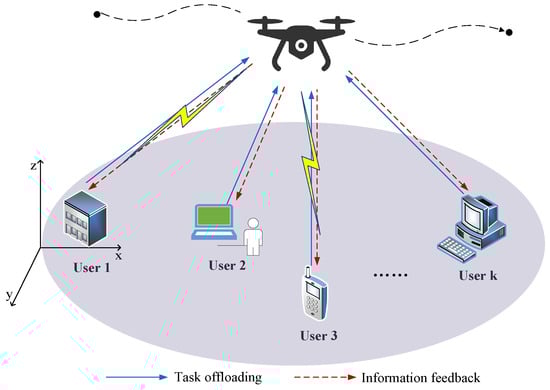 A UAV-assisted MEC system is depicted in Figure 1, which consists of the UAV and multiple users. The UAV, equipped with an MEC server, is capable of simultaneously transmitting information and providing edge computing service. Considering the limited computation capacities, the users are required to offload a portion of their computing tasks to the MEC server through the shared wireless network. Generally, the user’s computing tasks can be divided into two parts; one is computed locally, and the other is offloaded to the UAV for processing. The UAV aggregates the received information to form a new global model, and then feeds back the global information to the users. In order to enhance the energy efficiency and address the dynamic nature of entire system environment, the UAV’s flight needs to be frequently adjusted and controlled.