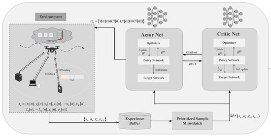 To address the subproblem of minimizing the system cost in terms of energy consumption and delay as in , deep reinforcement learning (DRL), which has shown remarkable ability in solving intricate network optimization challenges, is employed to achieve the desired trajectory of the UAV. Typically, DRL can be formulated as a Markov decision process (MDP), where the next system state depends solely on the current state and the action determined by the agent. To be specific, the MDP is defined by the tuple , where S, A, and R, respectively, represent the set of states, actions, and rewards, and P is the transition probability from state to state [35]. The following are the definitions for the state, action, and reward functions.