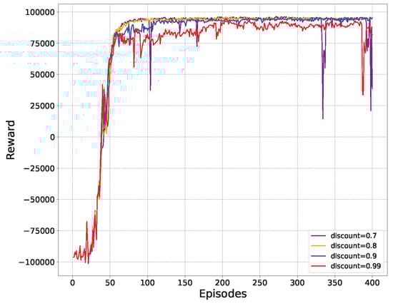 Figure 4 shows the convergence of the reward function and the effect of different discount factors on the reward. The results reveal that the model convergence speed is relatively fast, and the final convergence level of the reward function is comparable under the conditions of different discount factors. When the discount factor is and , there are abnormal fluctuations in the subsequent convergence stage, indicating that the exploration of action space is not comprehensive. Since there is no significant change in the final performance when the discount factor is , it indicates that the agent is able to learn the optimal policy.