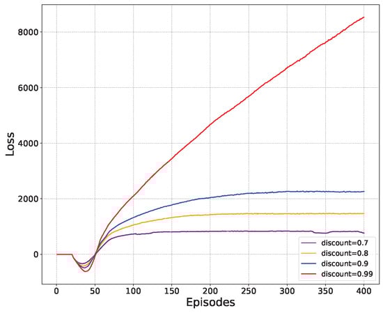 Figure 5 presents the correlation between the learning rate and the loss function. Initially, the learning rate shows a high sensitivity to the loss function of the model. In the case of a low learning rate, the value of the loss function still increases slowly even after multiple training episodes. Conversely, in the case of a higher learning rate, the loss function rises rapidly, but it eventually takes a long time to converge. To ensure more comprehensive exploration of the agent’s action space, it is better to keep a smooth increase in the loss function and ultimately reach the optimal value. To sum up, the discount factor 0.9 is selected as a moderate discount factor to achieve the desired result.
