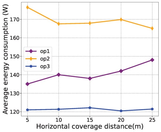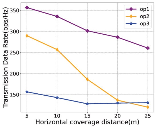For performance evaluations, Figure 6, Figure 7 and Figure 8 illustrate the effects of different weight parameters, namely , , and , on different system performances, including the transmission data rate, average energy consumption, and number of service users. The parameters for the comparison experiments are set as shown in Table 3. The horizontal coverage distance is set to 5 m, 10 m, 15 m, 20 m, and 25 m. It is observed from Figure 6 that, with the increase in the horizontal coverage distance, the transmission data rate decreases under all policies. In Figure 7, the average energy consumption under “” is higher than that of “” and “” because the weight of energy consumption is set to 0 in “”. As can be seen from Figure 8, as the horizontal coverage distance increases, the number of service users also increases. Overall, the transmission data rate and the number of service users under the “” policy are better than the other two strategies, and the energy consumption performance is slightly worse than that of the “” policy. This also validates that the proposed algorithm can successfully learn control strategies that simultaneously optimize multiple optimization objectives.