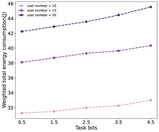 Figure 9 shows the relationship between the weighted total energy consumption of all users and the quantity of user tasks under scenarios with different numbers of users. It can be seen that the weighted total energy consumption increases when the amount of computing tasks becomes larger, and this can be inferred from Formulas (3) and (5). In addition, the weighted total energy consumption increases with the increase in the number of users, owing to the requirement of consuming more energy between the UAV and the users for computing and transmission purposes.