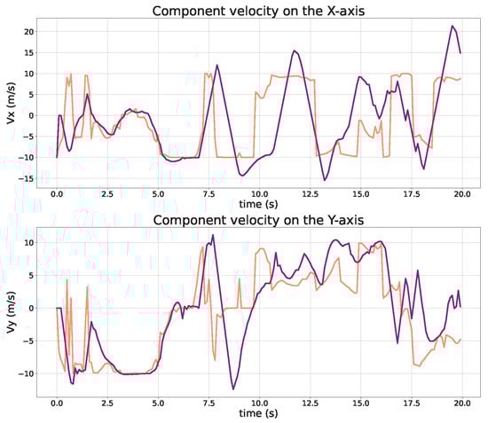Comparisons of UAV velocity (actual: purple, desired: red).