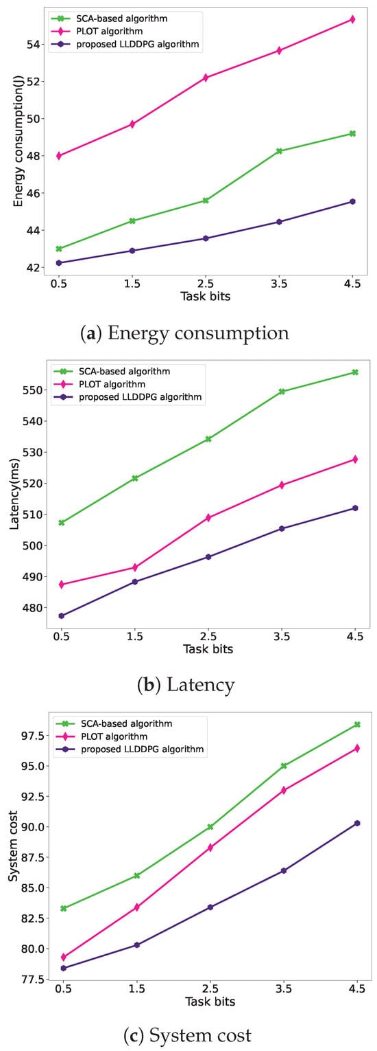 As depicted in Figure 13, it is revealed that, with the increasing task bit size, the energy consumption of the GCO algorithm escalates significantly greater than the others. Meanwhile, the TSP algorithm exhibits a notably higher latency compared to the other two algorithms. In contrast, the proposed LLDDPG algorithm achieves the lowest total system cost in the UAV-assisted MEC system, effectively optimizing the total weighted energy consumption and delay of the system.