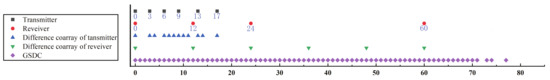 In Figure 1, we present an instance of the proposed GNA-MIMO radar with a six-element transmitter array and a four-element receiver array. The position of the array element is determined based on the aforementioned design rules. Considering the symmetric property of difference co-array, only the non-negative part of the GSDC is plotted. Figure 1 illustrates that although elements in the transmitter and receiver arrays are sparsely located, the GSDC still has a long consecutive segment.