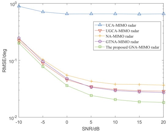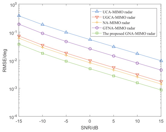 Figure 4 shows the CRB curves of five MIMO radars where the SNR ranges from −15 dB to 15 dB and snapshots . It can be observed from the figure that the CRB curve of the proposed GNA-MIMO radar has a smaller corresponding value than that of the other four MIMO radars. Therefore, the MIMO radar designed in this paper has the best DOA performance theoretically.