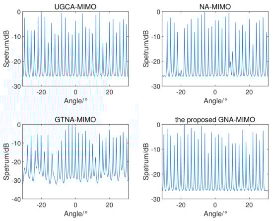 Figure 5 shows the spatial spectrum with the SS-MUSIC algorithm for four radar systems, except for the UCA-MIMO radar in [25]. Because of the limited consecutive DOFs of the UCA-MIMO radar, effective spatial spectra cannot be obtained. Assuming that there are incoherent targets in the far field evenly distributed from −30° to 30°. SNR = 3 dB; the number of snapshots ; the search range is from −31° to 31° and the step size is 0.01°. It can be seen from the figure that the MIMO radar designed in this paper can estimate incoherent targets far beyond the total number of physical array sensors. Moreover, the proposed GNA-MIMO radar exhibits more precise angular resolution and sharper spectral peaks.