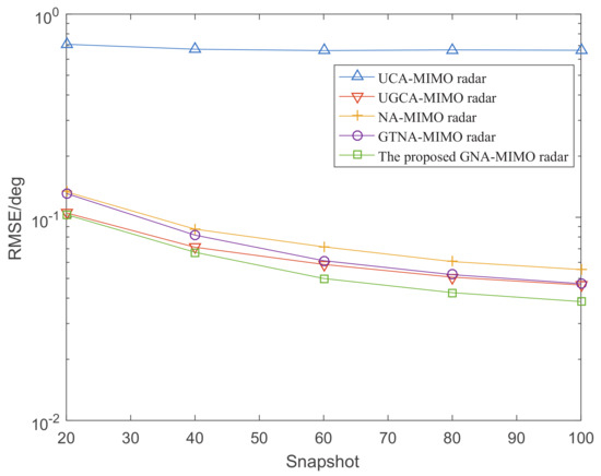 Figure 6 depicts the DOA estimation performance with different MIMO radars versus SNR, where the number of snapshots . Figure 7 illustrates the RMSE performance versus the number of snapshots, where SNR is set as 0 dB. It can be observed that the DOA estimation results become more and more accurate with the increase in snapshots and SNR. Specifically, under the condition of given snapshots and SNR, the proposed GNA-MIMO radar outperforms other MIMO radars due to its ability to provide pretty much more consecutive DOFs and a lower mutual coupling rate.