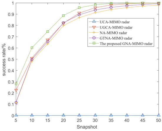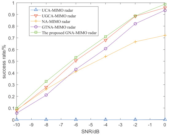 Figure 8 depicts the success rate of angle resolution with the variation of SNR when the number of snapshots is 10. Figure 9 demonstrates the success rate of angle resolution with the variation of snapshot number where SNR is −6 dB. From Figure 8 and Figure 9, it can be observed that as the SNR and snapshot number increase, the success rate of angle resolution improves. Obviously, under the same simulation conditions the proposed GNA-MIMO radar achieves the highest success rate of angle resolution.