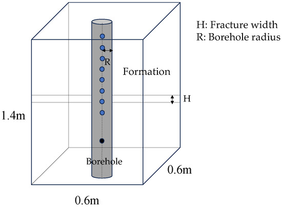 The finite difference method was employed in this study to simulate the sound field within the borehole based on the specified parameters [35,36,37]. We utilized a three-dimensional finite difference variable grid program to simulate the sound environment within the borehole. The fundamental principle of the finite difference method involves numerically calculating the properties of the medium and physical quantities using the wave equation. Subsequently, iterative processes involving velocity and stress were employed to determine the sound field at different time steps and locations. In the established three-dimensional finite difference model, small grids are necessary at the locations of fractures due to their thin nature within the formation. However, using small grids uniformly throughout the fracture regions would result in extensive computation and slow processing speeds. To address this, a non-uniform grid approach is employed, with small grids at fracture locations and larger grids elsewhere. This methodology effectively improves both the accuracy and efficiency of the calculations [38].