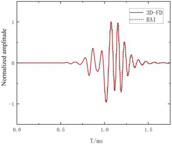 To validate the accuracy of the three-dimensional finite difference program, two verification approaches will be employed: one without fractures and one with fractures. Firstly, the waveform of the borehole pattern without fracture was calculated based on the three-dimensional finite-difference numerical simulation program and compared with the real-axis integral diagram. As shown in Figure 4, it can be observed that the primary wave modes, such as refracted compressional waves, shear waves, and Stoneley waves, exhibit consistency with the real-axis integral waveform. This validates the effectiveness of the finite difference method and program in the absence of fractures. Secondly, a three-dimensional finite difference numerical simulation program was used to compute the array waveforms of a borehole formation model with a fracture width of 0.2 mm. As illustrated in Figure 5, the results indicate that the primary wave modes, including refracted compressional waves, shear waves, and Stoneley waves, are well defined and exhibit clear characteristics, aligning with theoretical expectations. Further validation was conducted with a fracture width of 0.2 mm by comparing the refracted compressional and shear wave velocities of eight waveforms generated at different Transmitter–Receiver (TR) spacings. These velocities were calculated by using the STC (Slowness Time Coherence) method, resulting in a compressional wave velocity of 4035 m/s and a shear wave velocity of 2244 m/s. Comparing the data to the parameters of the model (detailed in Table 1) demonstrates that the calculated refracted P-wave and S-wave velocities are consistent with the P-wave and S-wave velocities in Table 1, confirming the accuracy of the finite difference method and program under fracture conditions. The verification conducted for both cases, with and without fractures, validates the accuracy of the finite difference method and program.