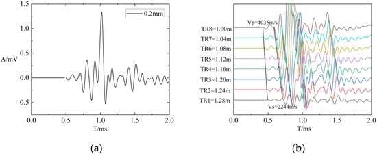 Waveform of a borehole formation model with a fracture width of 0.2 mm: (a) waveform with a 1.28 m TR spacing; (b) array waveform.