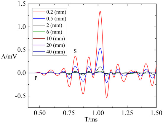In the simulation calculations using the finite difference program, the source dominant frequency was set to 8 kHz, with a Transmitter–Receiver spacing of 1.28 m. Both the borehole and fractures were filled with water, while other medium parameters were outlined, as shown in Table 1. To investigate the influence of fracture width on borehole wave modes, various fracture widths were defined. Figure 6 presents a waveform comparison for fracture widths of 0.2 mm, 0.5 mm, 2 mm, 6 mm, 10 mm, 20 mm, and 40 mm. As shown in Figure 6, an increase in fracture width leads to a significant decline in the waveform amplitudes of both refracted P-waves and S-waves, accompanied by a notable increase in attenuation. This observation highlights the sensitivity of these waves to changes in fracture width. However, it is worth noting that beyond a certain threshold, the amplitude variation trend in refracted P-waves and S-waves becomes less pronounced. This is due to the increasing presence of water within the fracture as its width increases, resulting in progressively greater energy attenuation in both the P-waves and S-waves. Eventually, this attenuation reaches a plateau and stabilizes. In summary, the results underscore the significant influence of fracture width on borehole wave modes. As fracture width increases, the amplitudes of refracted P-waves and S-waves diminished noticeably, and the attenuation effect became more pronounced. However, beyond a certain threshold, the amplitude changes in P-waves and S-waves became less evident. The findings of these studies are crucial for both theoretical and practical applications. They significantly contribute to the meticulous assessment of fracture property parameters and offer valuable insights into the investigation of rock mechanics parameters within geological formations.