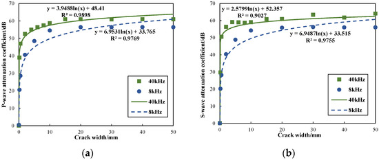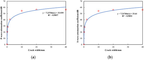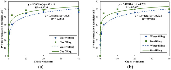 Variation in attenuation coefficient with fracture width: (a) relation of the attenuation coefficient of P-waves with fracture width; (b) relation of the attenuation coefficient of S-waves with fracture width.