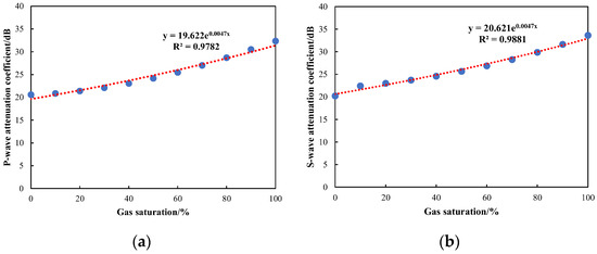 Variation in attenuation coefficients with gas saturation: (a) relation of attenuation coefficient of P-waves with gas saturation; (b) relation of attenuation coefficient of S-waves with gas saturation.