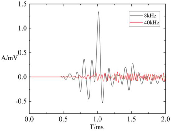 To explore the impact of source dominant frequency on borehole wave modes, the source dominant frequencies were set to 8 kHz and 40 kHz for numerical calculations. The source dominant frequency in physical experimental research is generally much higher than the dominant frequency of actual well logging. The simulation at 40 kHz aims to study the effect of frequency on energy attenuation in fractures. The results will then be used to guide the evaluation of fractures based on actual array acoustic logging data from physical experiments. Under these two different frequencies, a full-waveform comparison was carried out when the fracture width was 0.2 mm and the Transmitter–Receiver spacing was 1.28 m, as shown in Figure 12. The comparison reveals that, for the same fracture width, the amplitude of the wave modes at the higher frequency (40 kHz) is lower than that at 8 kHz. This phenomenon occurs because the absorption of acoustic signals by the medium increases proportionally to the square of the source dominant frequency. In other words, under the same conditions of fracture width and medium properties, higher-frequency acoustic signals experience faster attenuation. Figure 13 depicts the relationship between refracted compressional and shear wave attenuation coefficients with varying fracture widths at different dominant frequencies. It presents the attenuation coefficients for fracture widths of 0.2 mm, 0.5 mm, 2 mm, 4 mm, 6 mm, 8 mm, 10 mm, 15 mm, 20 mm, 30 mm, 40 mm, and 50 mm. It was evident that when the dominant frequency was 40 kHz, the attenuation coefficients of refracted P-waves and S-waves increased with fracture width at a faster rate compared to when the dominant frequency was 8 kHz. Consequently, under identical fracture width conditions, the refracted compressional and shear wave attenuation coefficients are relatively larger at 40 kHz.