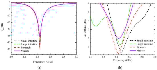 The antenna system is implanted into a multi-layer simulation of human tissue for simulation and analysis. The antenna is embedded in the small intestine human model with a radius of 20 mm and a height of 60 mm. To better simulate the working environment of the system in the human body, the antenna is located on the right side along the median axis, as illustrated in Figure 1d. This is because the position of the human organ, the small intestine, is more obviously biased towards the right side of the human body. The outer layer of the small intestine model is a muscle model with a radius of 52 mm and a thickness of 32 mm, the outer layer of the muscle model is a fat model with a radius of 56 mm and a thickness of 4 mm, and the outermost layer is a skin model with a radius of 60 mm and a thickness of 4 mm. The electrical properties of the simulated environment are the same as those of human tissues, and Table 2 presents the dielectric constants and conductivities of these human tissues at a 2.45 GHz frequency, e.g., the skin tissue at a 2.4 GHz frequency has a dielectric constant of 41.3 and a conductivity of 1.464 S/m [24]. We implanted the system into different human digestive systems for simulation testing. The simulation environment is shown in Figure 1d, with the difference being that the electrical characteristic parameters of the small intestine are replaced by those of other tissues. The simulation results are illustrated in Figure 2, in which the S11 plot shows the robustness of the system, which can well cover the 2.45 GHz frequency band for different human organs. The axial ratio (AR) plot can be observed that the antenna has circular polarization characteristics in different human organs, so the design has high stability and can meet the complex working environment. The antenna system is set on the right side of the central axis of the multilayer human tissue model with an implantation depth of 30 mm.