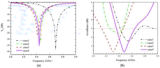 Simulation results for the four cases in S11 and AR. (a) S11, (b) AR.