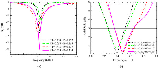Influence of different parameters H1 and H2 on the proposed antennas. (a) S11, (b) AR.