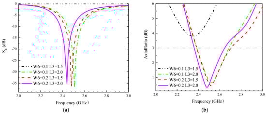 Influence of different parameters W6 and L3 on the proposed antennas. (a) S11, (b) AR.