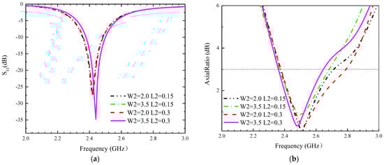 Influence of different parameters W2 and L2 on the proposed antennas. (a) S11, (b) AR.