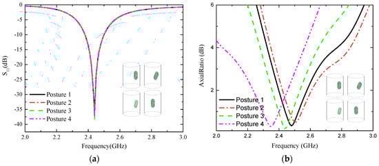 In addition, it is considered that after the capsule system enters the human body, the system undergoes an uncontrollable change in the bit position. Therefore, considering these factors, as Figure 7 shows the impedance matching S11 and axial ratio plots at different postures, it can be clearly seen that the impedance bandwidth is almost unchanged at different postures, with large differences only in amplitude. Moreover, the axial ratio bandwidth undergoes varying degrees of changes but still stably covers the operating frequency band. Therefore, the designed capsule endoscopy system maintains excellent stability in various positions.