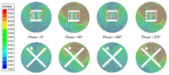 To understand more about the operating principle of the antenna, Figure 8 displays the surface current profiles of the antenna in different phases at 2.4 GHz. At 0° and 180°, most of the surface currents are concentrated on both sides of the slot, but the direction of the currents in each phase is opposite. At 90° and 270°, most of the surface currents are concentrated on the top side of the patch and GND, and the directions are opposite. The cumulative effect of these different phases of surface currents produces circular polarization [25].
