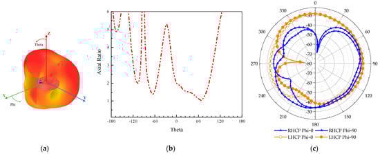 The simulated 3D radiation pattern, AR, and the LHCP and RHCP at 2.4 GHz. (a) Three-dimensional radiation pattern. (b) AR. (c) LHCP and RHCP.