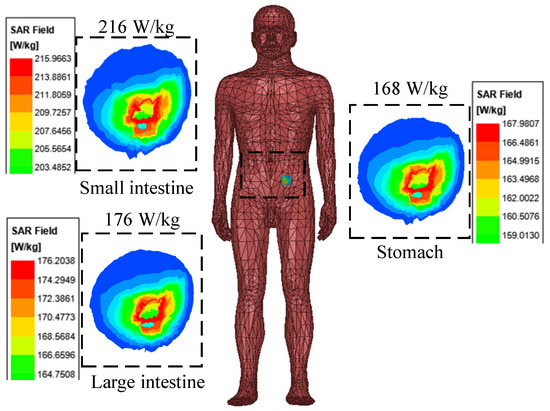 The simulated SAR distribution in skin model (1 g) at 2.45 GHz. The simulation results in the dashed box show the maximum specific absorption rates of the antenna in the small intestine, large intestine, and stomach, which are 216 W/Kg, 176 W/Kg, and 168 W/Kg, respectively.