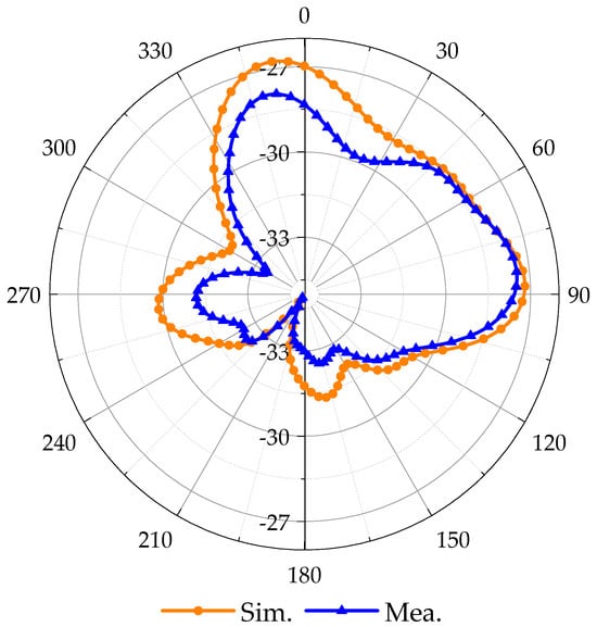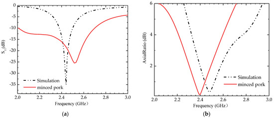 The simulated and tested S11 is shown in Figure 12. This test was performed only in fresh minced pork tissue, where the bandwidth was 0.67 GHz (2.02–2.69 GHz) and the AR bandwidth was 0.28 GHz (2.26–2.54 GHz). Figure 13 compares the simulated and measured E-plane (Phi = 0 degree) radiation patterns, where the simulated and measured realized gain peaks are −26.7 dBi and −27.8 dBi, respectively. The simulated and measured ones have more significant errors.
