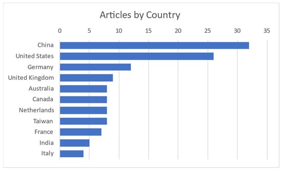 It is obvious and mentioned in most of the articles that this field of interest became needed more and more with the COVID-19 pandemic to monitor vital signs without primary contact with the patient. Today, as modern society gets older, it is needed to monitor elderly people from their homes. Contact measurements mostly have some discomfort or body intrusion elements, while contactless ones can even be unnoticed. Most publications on the subject are coming from China and the United States, as shown in Figure 3.