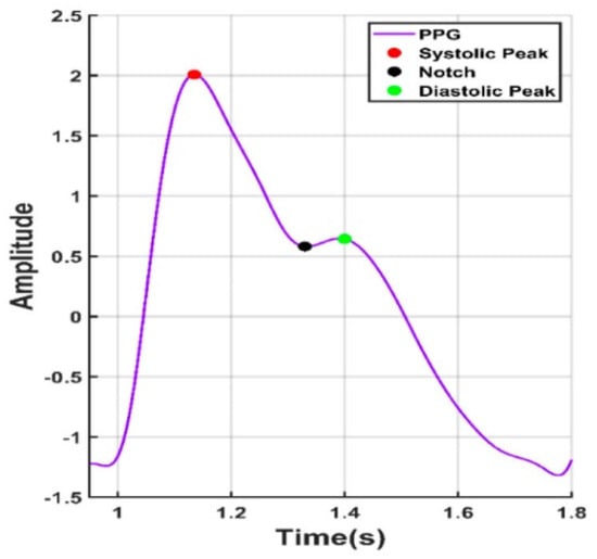 Looking forward in terms of research possibilities, by obtaining reliable rPPG readings in the form of oscillometric pressure pulse waves, this would open up even more medical information about the tested person, like their history of arrythmia or blood pressure [137]. In the overviewed PPG articles, there were attempts to obtain blood pressure by measuring the time between the heart cycle start, pulse peak and heart cycle end, like in Figure 6.