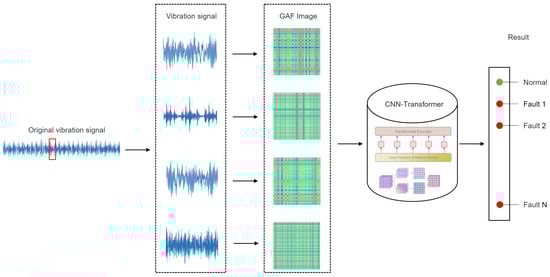 Incorporating principles from GAF, CNN, and Vision Transformer theories, we present a novel fault diagnosis approach that integrates feature extraction and fault pattern recognition, facilitating accurate and efficient fault classification. The fault diagnosis procedure is illustrated in Figure 3, with detailed steps outlined below.