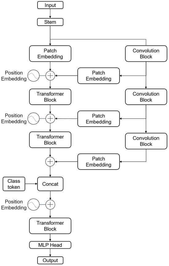 The architecture of the proposed CNN-ViT model, as shown in Figure 4, consists of three main parts: the stem block, the CNN branch, and the ViT branch. First, the GAF image is input into the stem block for initial feature extraction. This block captures multi-scale local features using three parallel paths with convolution and pooling operations of different kernel sizes (3 × 3, 5 × 5, and 7 × 7). The initially processed feature maps are then directed to both the CNN branch and the ViT branch. The CNN branch and the ViT branch each consist of multiple convolutional modules and Transformer modules. This parallel structure allows the model to maximally retain both local features and global representations. The Patch Embedding acts as a bridging module, linearly mapping the complete feature map into a sequence of feature patches and gradually transmitting the local feature map to the Transformer branch. This integration enables the local representation feature map from the CNN branch to merge with the global feature representation map from the Transformer branch. Additionally, positional encoding is added to understand the global context and long-range dependencies. Finally, the output results are obtained through a fully connected layer.