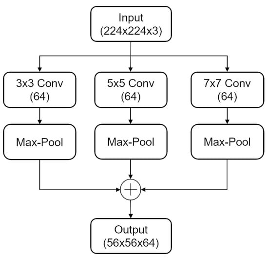 1. The stem block is used to extract initial local features, such as edge and texture information, from the GAF image using a three-branch parallel structure. In the first branch, a convolution operation of size 3 with a stride of 2 is applied, followed by a max pooling layer with a size of 3 and a stride of 2. The second branch involves a convolution operation of size 5 with a stride of 2, followed by a max pooling layer with a size of 3 and a stride of 2. Similarly, the third branch employs a convolution operation of size 7 with a stride of 2, followed by a max pooling layer with a size of 3 and a stride of 2. Local features at different scales of the original input image are extracted from each branch, and the resulting feature maps are aggregated by summation to serve as input for the CNN and ViT branches. For an input image of size 224 × 224 × 3, the output after the stem module is a 56 × 56 × 64 feature map. The structure of the stem block is depicted in Figure 5.