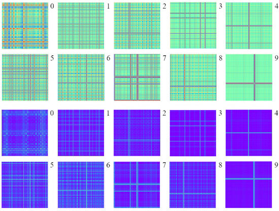 After converting the normalized time series into polar coordinates, the cosine value of the polar angle sum or polar angle difference between each time series point can be considered separately to identify the time correlation in different time intervals []. Therefore, it can be divided into the Gramian Angular Difference Field (GADF) based on the sine function and the Gramian Angular Sum Field (GASF) based on the cosine function, as defined by Equations (3) and (4).