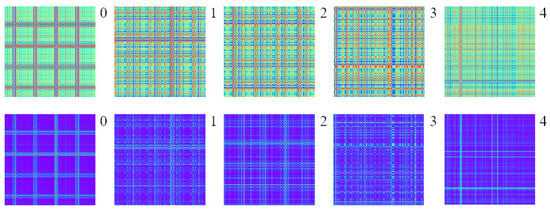 Each category of failure state signals of CWRU bearing data is divided into 2400 samples by sliding window sampling, i.e., 240 samples for each category. Then, the vibration signal samples are converted into 2400 images by GAF coding as the data set, and the GAF images of ten fault states are shown in Figure 6. Similarly, each type of fault state signal of XJTU-SY bearing data is divided into 4000 samples by sliding window sampling, i.e., 800 samples for each category, and then, the vibration signal samples are converted into 4000 images by GAF coding as the data set, and the GAF images of five fault states are shown in Figure 7.