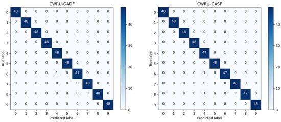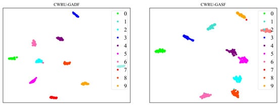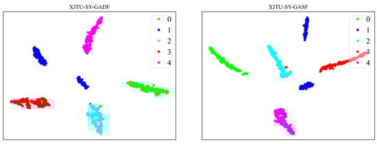 To better illustrate the performance of the model, we employ the nonlinear dimensionality reduction algorithm, t-SNE [], to project and visualize the data in a two-dimensional space. Specifically, for the CWRU dataset, Figure 10 showcases the t-SNE visualization results of the CNN-ViT model when extracting fault features from both GADF and GASF images. Meanwhile, the t-SNE visualization outcomes for the XJTU-SY dataset, illustrating the CNN-ViT model’s feature extraction from GADF and GASF images, are depicted in Figure 11.