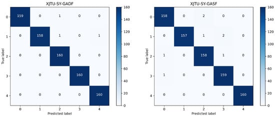 To better show the experimental results of the model for different fault types, a confusion matrix was introduced to visualize the prediction results, where the horizontal axis is the prediction label, and the vertical axis is the true label. The confusion matrix of the classification results for ten bearing states of the CWRU dataset is shown in Figure 8, and the confusion matrix of the classification results for five bearing states of the XJTU-SY dataset is shown in Figure 9.