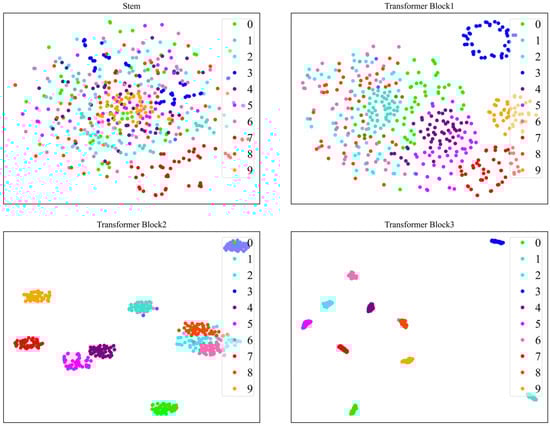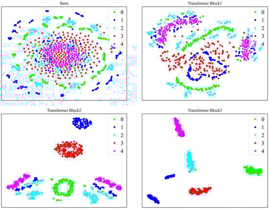 In order to understand the process of feature extraction by the model more clearly, we visualize the outputs from the Stem module and the three Transformer Blocks using t-SNE. Taking the GADF images from both the CWRU and XJTU-SY datasets as examples, Figure 12 and Figure 13, respectively, illustrate this process.