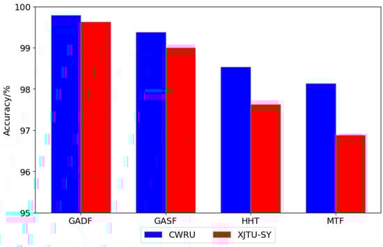 From the above experiments, it can be seen that the CNN-ViT architecture proposed in this paper achieves better fault diagnosis results on public datasets by introducing convolution operators from CNNs to extract local features of images and self-attention mechanisms from Transformers to capture global representations. To further verify the reliability of the image encoding method proposed in this paper, we compared it with other image encoding methods. One method converts the original one-dimensional signal into a time-frequency map based on the Hilbert–Huang Transform (HHT), and another method encodes the original one-dimensional signal into feature images based on the Markov Transition Field (MTF). The training and testing sets were divided in the same proportion. The training and testing sets were then input into the CNN-ViT model for feature extraction and fault classification. The results, as shown in Figure 14, indicate that the recognition rates of GAF images are higher than those of HHT images and MTF images, with the highest recognition rate achieved by GADF images. This demonstrates that the GADF image encoding method has better signal reconstruction ability and can more effectively express vibration signal characteristics, making it more suitable for bearing fault classification and diagnosis compared to other image encoding methods.