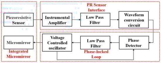An electromagnetic micro mirror system was proposed to improve the scanning performance. The system block diagram proposed is shown in Figure 1. A micro mirror device with an integrated PR sensor was designed. The PR sensor, highly doped, was located at the edge of the supporting beam to realize the torsion angle detection of the micro mirror. The output of PR sensor was followed by an instrumental amplifier, the low pass filter, and waveform conversion circuits. The PR interface circuit adjusted the waveform and amplitude of the PR sensor output signal. The circuit composed of a PLL circuit and waveform conversion circuits was used to drive the electromagnetic micro mirror. The basic PLL consists of a phase detector (PD), a low-pass filter (LPF), and a voltage-controlled oscillator (VCO). The system can also reduce the complexity and chip area occupied, increasing the possibility of low-power and lightweight design. It achieves high-speed and high-precision scanning, and, meanwhile, it saves resources. Simulation of the driving system, which is highly non-linear, was achieved using MATLAB Simulink and was applied to the electromagnetic micro mirror. This paper is focused on the modeling of the micro mirror driving system. The finite element model of the micro mirror with an integrated PR sensor was developed in ANSYS. Meanwhile, the model of the driving circuit and micro mirror at the behavioral level was developed in MATLAB Simulink.