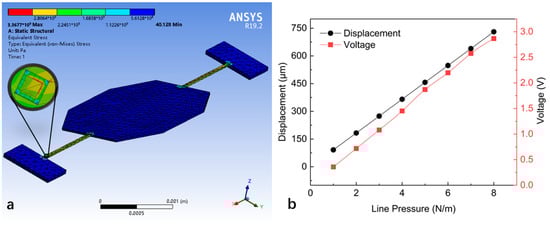 The finite element simulation of the electromagnetic micro mirror with an integrated PR sensor in ANSYS: (a) the model of the electromagnetic micro mirror with an integrated PR sensor; (b) the torsion displacement and voltage output simulated in the mechanical–piezoresistive coupling field analysis.