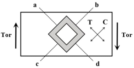 The proposed PR sensor was a silicon PR sensor with a Wheatstone bridge structure, as shown in Figure 4. The PR sensor was integrated on a square torsion beam structure. When the micro mirror flipped, the torque caused the torsion of the fixed beam, resulting in tangential tensile stress T and compressive stress C on the surface of the beam. One pair of bridges was subjected to compressive stress, resulting in a decrease in resistance, while the resistance of the other pair of bridges increased due to tensile stress. The relative change in the resistance value of the bridge changed the partial voltage of the resistance. The potential difference can be described as