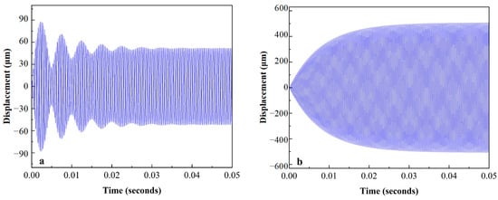 The impulse response of the micro mirror was simulated by the model linearization. As shown in Figure 8, the model exhibited different movements under different conditions after the action of the same pulse. The micro mirror with infinite Q-factor oscillated continuously at the natural frequency, but the one with finite Q-factor gradually stopped oscillating within 0.0423 s due to damping. Therefore, external force compensation was needed for a continuous oscillation to drive the micro mirror. The Lorentz force, which was excited by a sinusoidal voltage of 3800 Hz with an amplitude of 1.5 V and a magnetic field of 100 mT, was applied to the micro mirror model, and the vibration with a maximum displacement of 52.09 μm stabilizes at about 0.043 s, as depicted in Figure 9a. However, the maximum displacement of the model was up to 488.4 μm when excited by a sinusoidal voltage of 4000 Hz with the same amplitude in Figure 9b. The maximum displacement is the torsional displacement at the edges of the micro mirror, which is linearly related to the torsion angle θ. The relationship can be expressed as follows