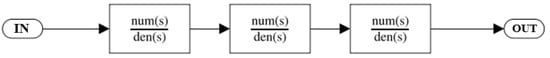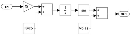 The behavior-level model of the micro mirror system was established in MATLAB Simulink, as shown in Figure 10. XOR networks are used as PDs to compare the output of VCO with the feedback of micro mirror plates. The subsystems’ performance of the micro mirror, LPF, and VCO were established, respectively. The block diagram of VCO and LPF are shown in Figure 11 and Figure 12, as described in Equations (5) and (6). LPF is a third-order LPF that filters the error signal and transmits it to VCO. The ideal VCO output is a sine wave, and its output frequency is completely linearized with the input voltage. The part from XOR to VCO implements the function of phase-locked loop. When VCO excites the micro mirror at the initial frequency, the signal frequency fed back by the PR sensor of the micro mirror will shift towards the resonant frequency. The difference between feedback frequency and excitation frequency will be captured by a phase-locked loop and tracked until it reaches the resonant frequency point and stabilizes, achieving resonant driving.